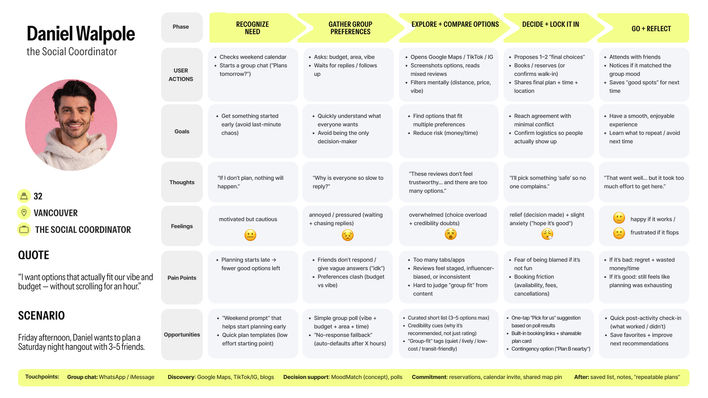The project followed a structured Human-Centred Design approach from research through final implementation. The process began with user research and interviews to understand how individuals track emotions and the challenges they face in maintaining emotional awareness and daily decision-making. Insights were synthesized through affinity mapping to identify behavioural patterns and define key problem areas. Based on these findings, user personas were developed to guide design decisions and ensure alignment with real user needs.